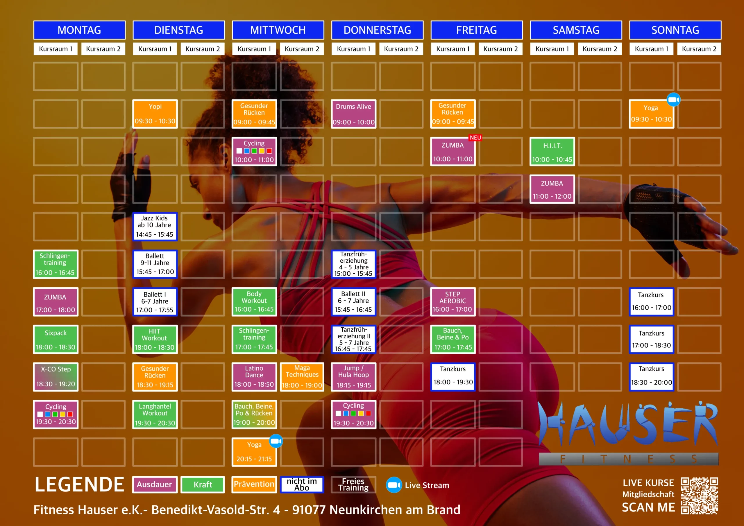 Ist Dir das Training im Classic Fitnessbereich zu langweilig? Trainierst Du gerne mit Musik und lässt dich mit der Gruppe mitreisen? Dann bist Du hier in unserem Kursprogramm bestens aufgehoben! Mehr als 25 Kurse pro Woche in einem großzügigen Kursraum von ca. 130m². Somit bieten wir einen der größten und modernsten Kurspläne der Region an. Wähle selbst welches Ziel Du verfolgst und mach mit.